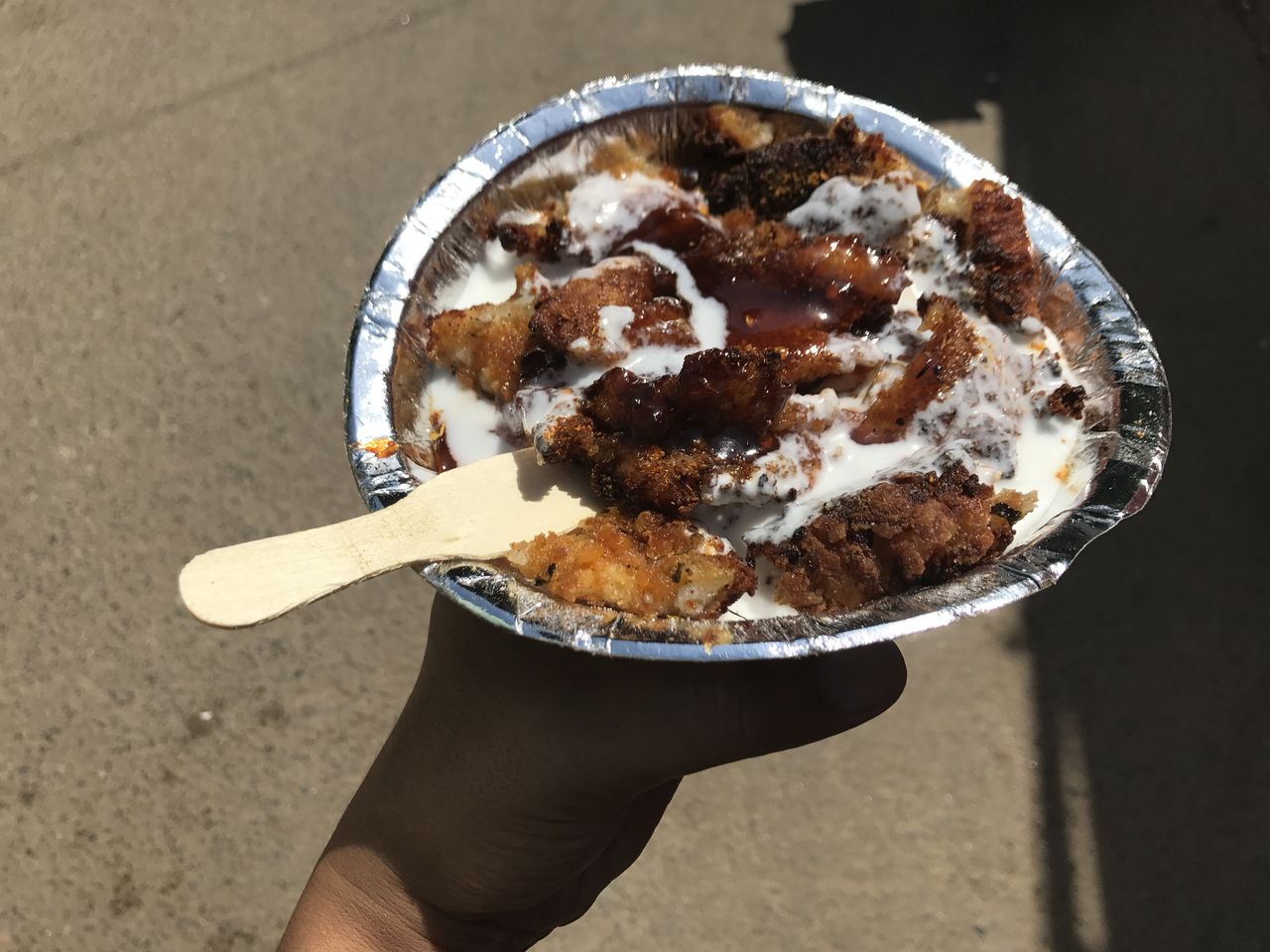 このお店はスパイスと甘めのトマト系のソース、そしてヨーグルトをかけてくれる。美味しい
