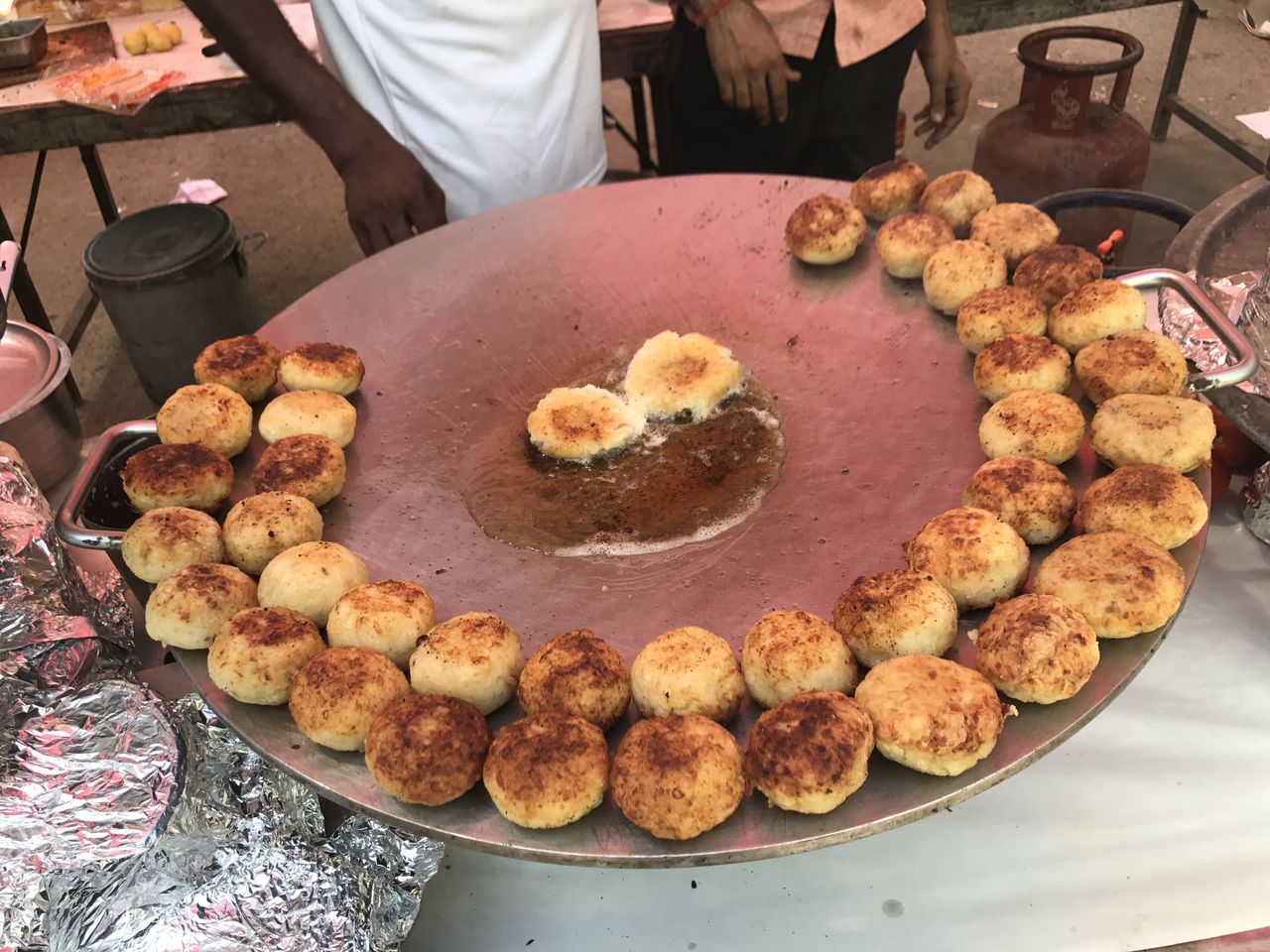 茹でたジャガイモのをすり潰してから丸く成形。それを揚げたモノが鉄板の淵に並べられている